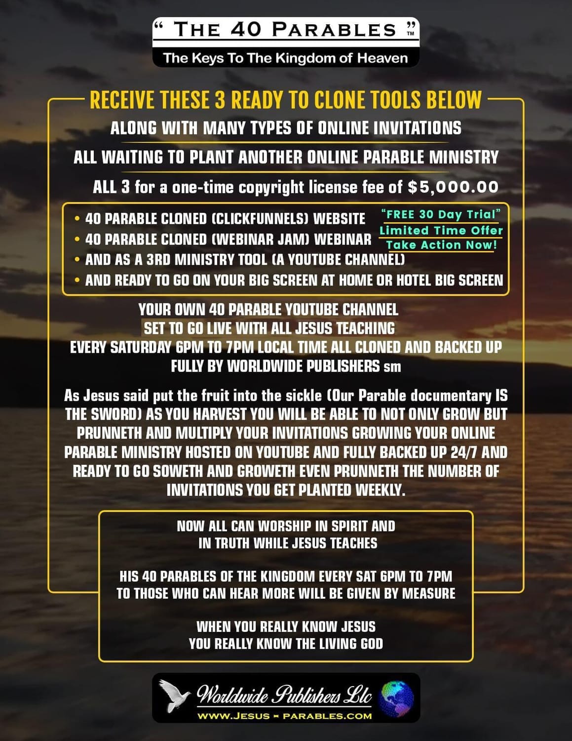 Enter "40 Parables" into YouTube to see what you received cloned by Worldwide Publishers sm.